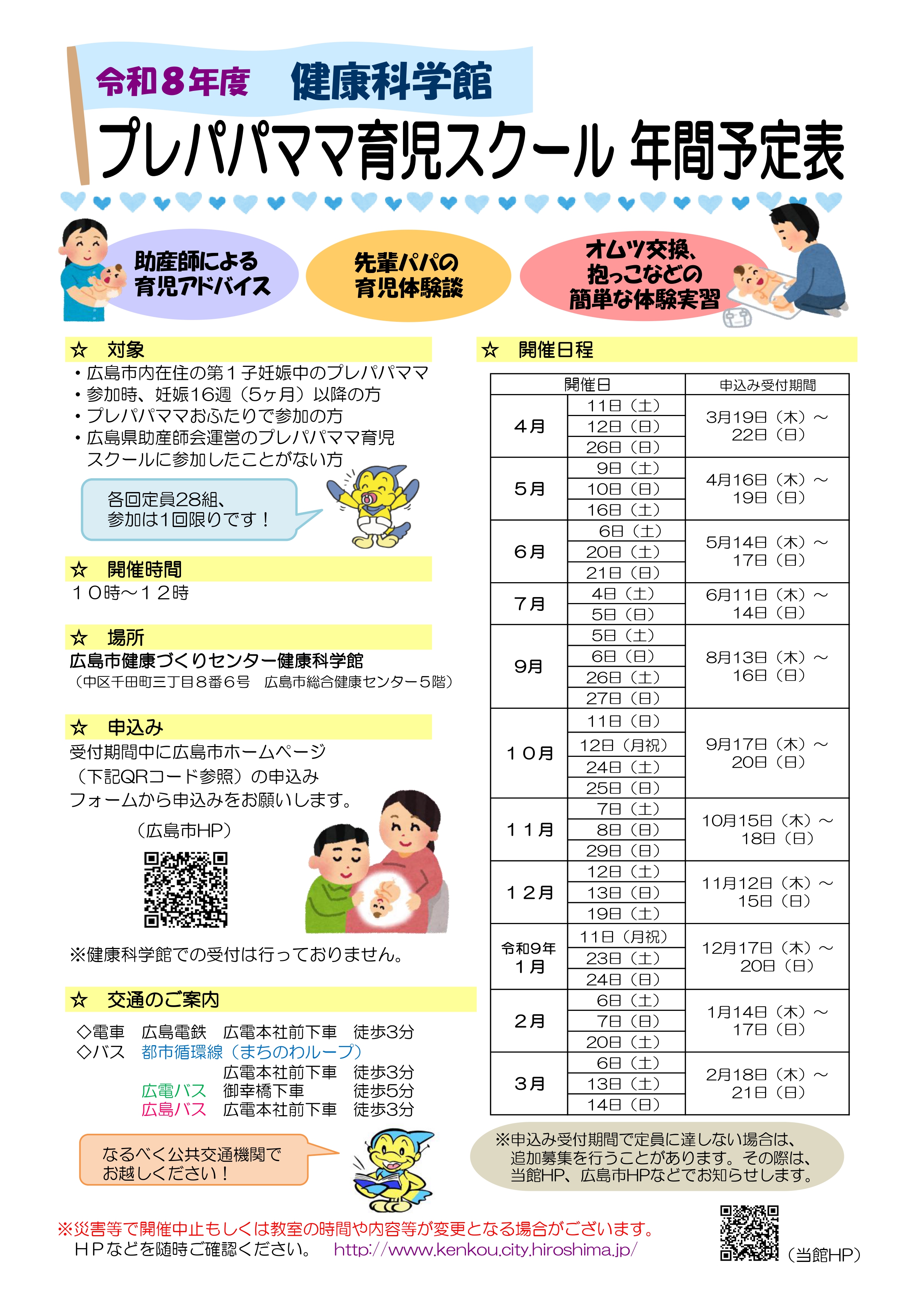 申込みは、広島市のホームページ「プレパパママ育児スクール」の 申込みリンクから行ってください。 ※各月ごとに申込み期間が異なりますので、ご注意ください。 ※定員は28組です。応募者数が定員を超える場合は、抽選となりますので、あらかじめ、ご了承ください。 |